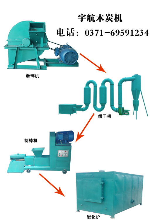 木炭機(jī)設(shè)備是把原料竹木鋸末、花生殼、玉米棒、甘蔗渣、棉花稈、玉米稈、稻谷殼、雜樹枝等經(jīng)木屑粉碎機(jī)粉碎成10mm之內(nèi)的顆粒狀,經(jīng)烘干機(jī)烘干使之含水份含量在12%以內(nèi),入制棒機(jī)經(jīng)高溫,高壓使之成型(不加任何添加劑)后放入炭化爐(自建土窯)進(jìn)行炭化,即成成品木炭.該木炭機(jī)生產(chǎn)的木炭密度大、體積小、可燃性好,可替代薪柴及燃煤.一般產(chǎn)品外徑為 50-60mm ,孔徑為 15-20mm ,呈空心四角或六角柱形.該產(chǎn)品尤其適用于北方地區(qū)秋冬燒炕取暖、大棚升溫或作普通生活燃料.木炭機(jī)全套設(shè)備包括制棒機(jī)、炭化爐、烘干機(jī)等設(shè)備組成。
